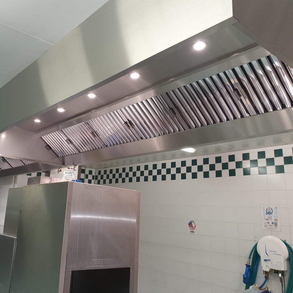 Installation système extraction d’air pour système de lave batterie et tunnel Hobart dans une cuisine professionnelle